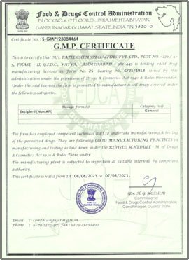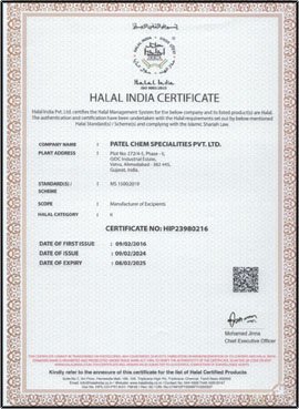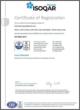 Patel Chem Specialities Limited in 2008 in India. The Company is GMP & ISO Certified and FDA Approved Manufacturer – Exporter Promoting Quality Products in Pharmaceutical Excipients like Carboxymethyl Cellulose Sodium IP, BP, EP, USP-NF, Croscarmellose Sodium IP, BP, EP, USP-NF, Sodium Starch Glycolate IP, USP-NF , Sodium Starch Glycolate BP, EP and Calcium CMC BP, EP, JP, USP-NF and speciality chemicals like Sodium Monochloro Acetate, Cellulose Powder and Carboxy Methyl Starch.