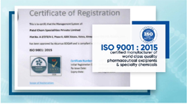 Patel Chem Specialities Limited – ISO Certified Company follows Stringent Quality Standards as well as Quality Procedure so every Employee is focus to follow Quality System. We have designed and implemented procedure to analyze all testing parameters as per FDA/Pharma Regulations right from Raw Material Testing to Finish Goods; this is maintained and recorded by all Employees for this department.